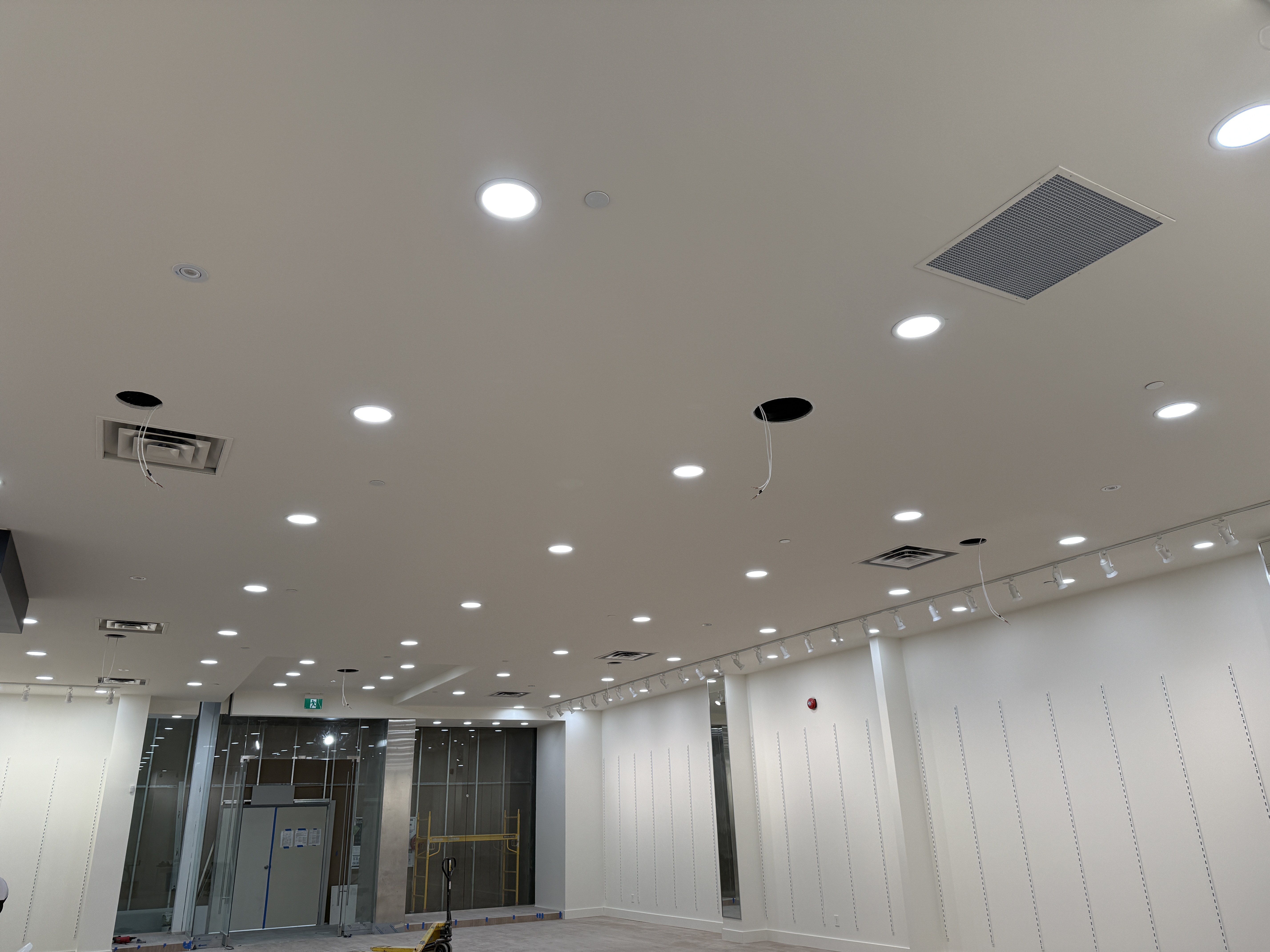 A picture of the inside of the store without anything in it. I wanted to grab a picture of the ceiling showing that all the speakers needed to be hooked up. The cabling dangling from the ceiling is where they go.