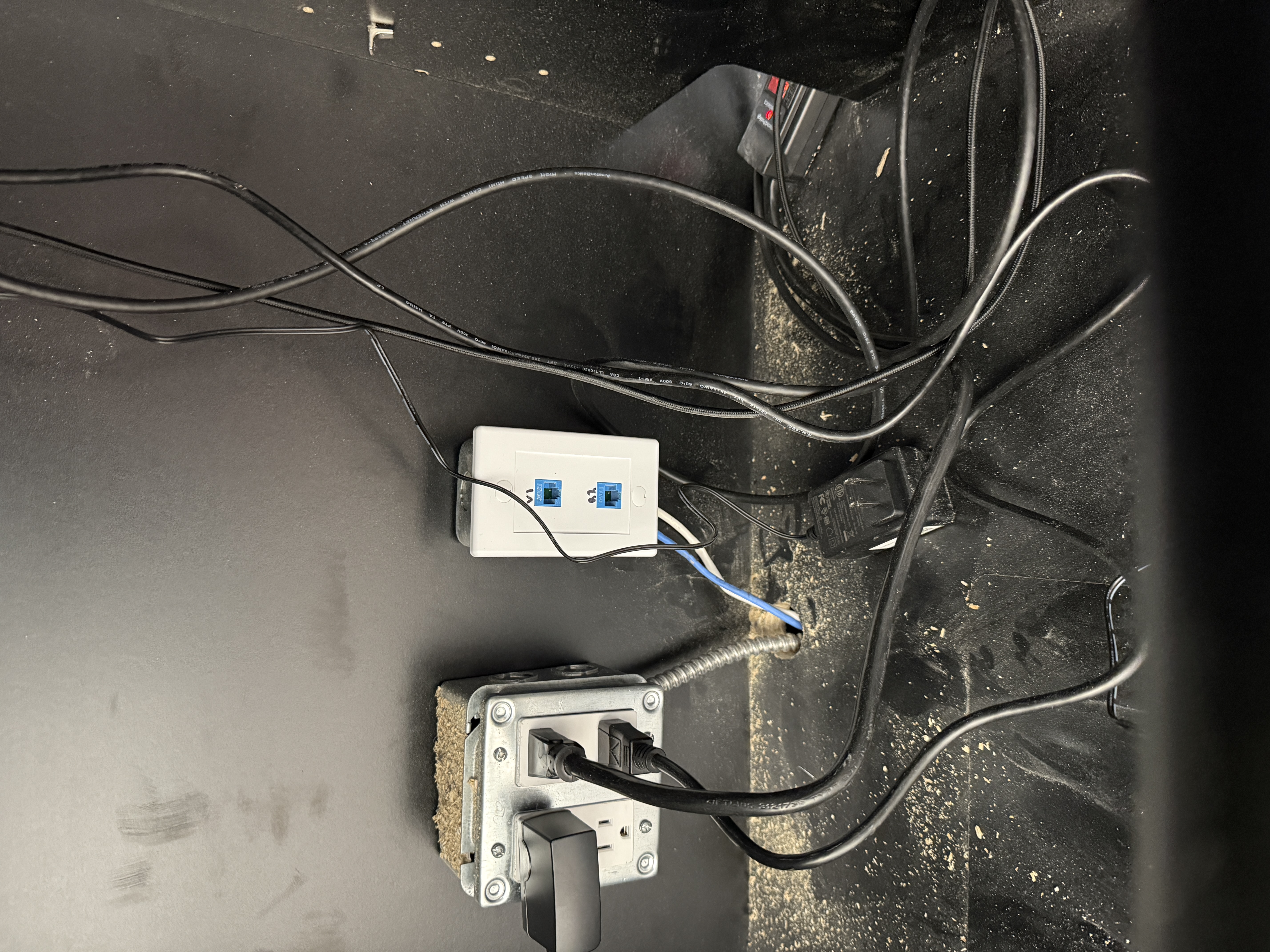 I'm just using filler as you can tell, but this is a picture of under the cash counter where all the hookups are. Each cash setup gets a full set of plugs, and 2 ethernet drops each.